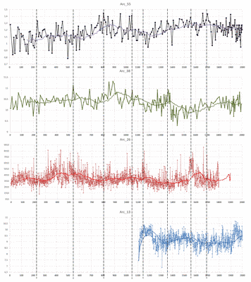 Bild 8 Proxis Bereich Arctic ARC_55; 38¸26; 13 des PAGES 2k Datensatzes vom Autor übereinander gelegt. Zeitachse genau, die Vertikalachsen sind nicht in vergleichbaren Maßstäben.