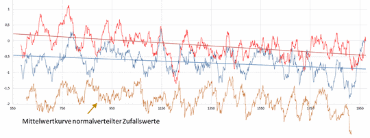 Bild 12 30-Jahre Mittelwerte der Proxis ARc_34 (blau) und ARc_36 (rot) des PAGES 2k Datensatzes. Normiert auf gleiche Spannweite und Endwert 0 im Jahr 1973. Zugefügt eine Mittelwertkurve normalverteilter Zufallswerte (braun) mit gleicher Auflösung und entsprechend der blauen Kurve schief gestellt