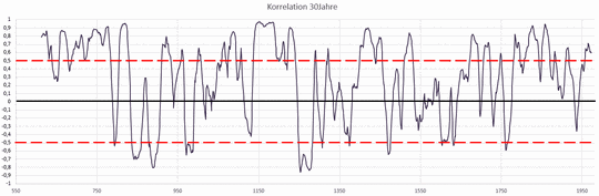 Bild 13 Korrelationsverlauf der 30-Jahre Mittelwerte der Proxis ARc_34 und ARc_36 (Bild 9.2) des PAGES 2k Datensatzes vom Jahr 613 – 1973