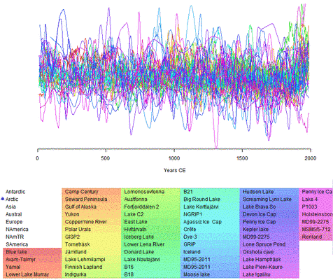 Bild 14.1 Alle Proxis Arctic NAmericaTR des Projekt PAGES 2k Datensatzes. Quelle: Active viewer for the Pages 2K Proxis