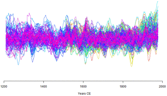 Falls mir ein Student mit einer Analyse wie dieser unterkommen würde, , würde ich ihn in sein Laboratorium zurückschicken, um bessere Daten zu bekommen. Mit paläoklimatischen Studien geht das nicht, aber ich frage mich, ob es nicht zumindest wert ist, Korrelationen zu berechnen zwischen Proxys, denen jedwede zugrunde liegende Hypothese fehlt, um abzuschätzen, ob die Daten überhaupt von Wert sind. Beispiel: Würde man nicht erwarten, dass alle geographisch benachbarten ,CAN-Reihen‘ miteinander ähnlicher sind als beispielsweise mit Zentralasien? Sollte nicht die Notwendigkeit bestehen, bevor man weitergeht und alles in den Mix hineinwirft? Anderenfalls scheint mir , dass Müll mit etwas vermischt wird, dass bereits nur ein sehr geringes Signal ist, und ich kann daran nichts Gutes finden.