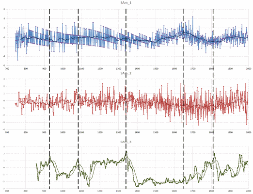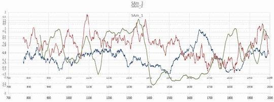 Bild 16 Proxis des PAGES 2k Datensatzes SAM_1; 2¸ 3 vom Autor übereinander kopiert. Mittelwerte (von Bild 15), Zeitachse genau, die Vertikalachsen sind in den Originalen nicht in vergleichbaren Maßstäben und wurden vom Autor deshalb auf eine ungefähr gleich große Spanne verschoben.