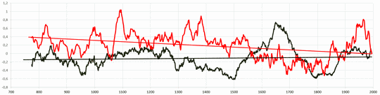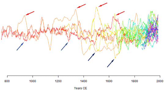 Bild 9, Mittelwerte aus Bild 8 (Proxis des Projekt PAGES 2k Datensatzes ARC_55; 38¸26; 13) vom Autor übereinander kopiert. Zeitachse genau, die Vertikalachsen sind nicht in vergleichbaren Maßstäben und wurden vom Autor verschoben.