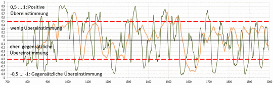 Doch auch die Übereinstimmung der Mittelwertverläufe selbst ist desaströs (Bild 13). Eine Übereinstimmung welche einen Münzwurf überschreitet (K >= +0,5) besteht nur für 42 % des Zeitraums, eine vollständig negative Korrelation (K < 0) besteht für 27 % des Zeitraumes.