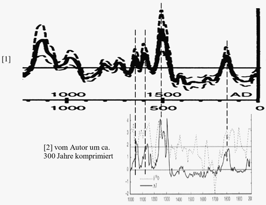 Der Verlauf Deutschland und auch der Stand zum Jahr 2000 sind nicht so exotisch wie man meinen könnte. Eine Proxirekonstruktion aus Island und Japan zeigen einen ähnlichen Verlauf. Erkennbar sind jedoch bei diesen beiden Proxis eklatante Zeitverschiebungen und gegensätzliche Max / Min-Verläufe (Bild 5). Gemeinsam ist ihnen eine große Temperaturspanne und das vollkommene Fehlen des Hockey-Stick-Endes.