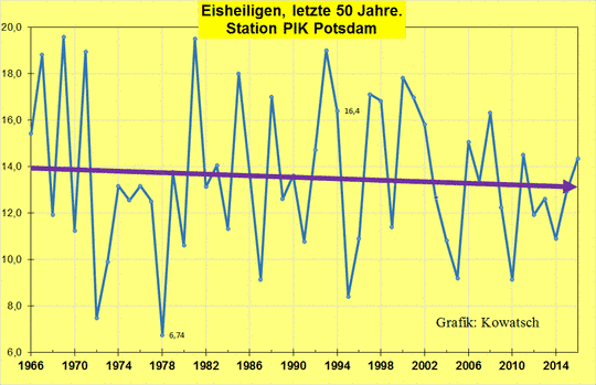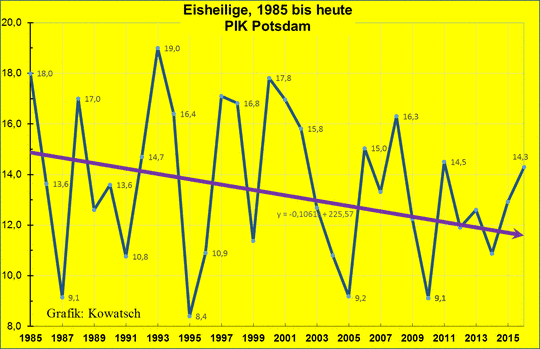 Fazit: Da die Erwärmungsgläubigen und die selbst ernannten Klimaretter alle in den Städten wohnen, fast alle grottenschlechte Naturbeobachter sind, sich zudem meist am beheizten Schreibtisch oder sich bevorzugt in den warmen Stuben ihrer vom Staat und damit von uns finanzierten Arbeitsplätze aufhalten und ihr Bezug zur freien Natur und zu den Weiten Deutschlands verloren ging, nehmen sie die Realität der kälter werdenden Eisheiligen überhaupt nicht mehr wahr. Selbst die Klimafolgenforscher beim PIK Potsdam sind fest überzeugt von ihrer Computer-Klimaerwärmung und Software-Erwärmungsspielerei, bloß richtet sich die Vegetation Deutschlands und auch ihre eigene Messstation nicht danach.