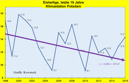 Bereits seit 50 Jahren werden die Tage vom 11. bis 15. Mai in Deutschland wieder kälter. Das ist ein langer fallender Trend. Nähert man sich der Gegenwart, dann nimmt der fallende Trend sogar zu. Also genau das Gegenteil von Heißheiligen. Jeder aufmerksame Naturbeobachter und Kleingärtner hat das schon längst durch Eigenbeobachtungen erkannt. Aber das zeigen auch eindeutig die Daten der Klimastation Potsdam und die Daten des Deutschen Wetterdienstes, obwohl diese nicht wärmeinselbereinigt sind. Die warnenden Meldungen der Deutschen Medien über angeblich immer wärmer werdende Eisheilige in der Gegenwart halten einer wissenschaftlichen Betrachtung nicht Stand. Kurz gesagt: Eine glatte Lüge, die uns seit Jahren aufgetischt wird. Wir müssen Herrn Friedrich vom DWD schon persönlich fragen: „Herr Friedrich, Kennen Sie überhaupt die eigenen Messdaten?