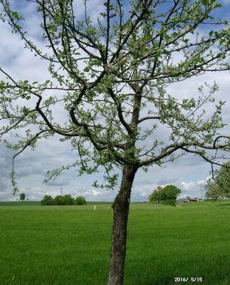 15.05.2016, letzter Eisheiligentag (kalte Sophie). Die Tageshöchsttemperatur betrug 8 C um 15 Uhr, vor Ort gemessen. Der Apfelbaum zeigt im Kronenbereich einzelne Blüten, sonst sind die Blütenknospen noch geschlossenen. Zur Vollblüte gelangen diese Apfelbäumchen auf 490 m NN oberhalb des Frankenbachtales erst nach Eisheiligen. Die wissenschaftlich botanische Frage ist somit: Woher wissen die Apfelbäume in der freien Fläche Deutschlands, dass sie mit dem Blühbeginn die Eisheiligen abwarten müssen, damit wenigstens der größte Teil ihrer Blüten nicht erfriert. Hoffen wir auf einen warmen Herbst, damit die Äpfel auch ausreifen können.