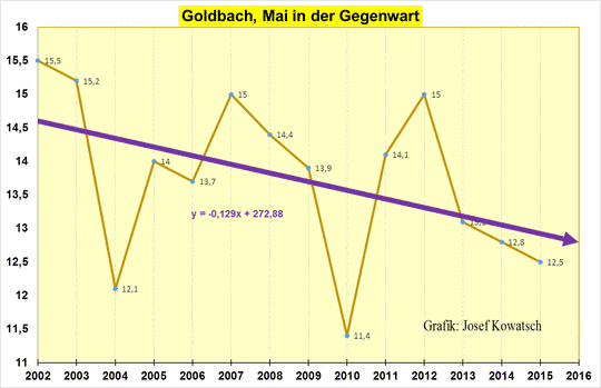 Grafik 2a: In diesem sehr kurzen Zeitraum, welchen der DWD in seinem Artikel „in den letzten Jahren“ benennt, ist der Mai in Goldbach auch kälter geworden, dies zeigt der direkte Vergleich mit Grafik 1a, die Trendlinienkennlinie wurde negativer. Zuvor y= -0,0234x, bei 15 Jahren y= -0,129x