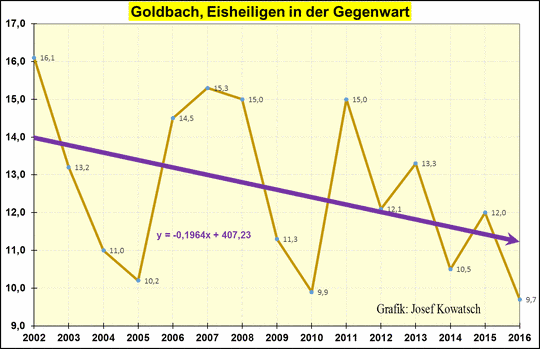Zunächst mal vielen Dank. Ich warte auch noch auf Amtsberg-Dittersdorf, und auf viele andere Stationsleiter, die meinen Artikel überprüfen. Bitte zeichnen Sie doch mal die Eisheiligentage Ihrer Station seit 1985 auf, (ich weiß, das kostet Zeit, vor allem können beim Übertragen leicht Fehler passieren). Leider geht Goldbach nur bis 1996 zurück. Ihre Station hat auch den Vorteil, dass sie auf dem 51.ten Breitengrad, also etwa in der mittleren Breite Deutschlands liegt. Bitte teilen Sie uns dann die negative Steigung Ihrer Trendlinie mit. Negative Steigung heißt Abkühlung der Eisheiligen. Ich erledige das aber auch selbst, wenn Sie die Werte der Eisheiligen hier in der Kommentarfunktion veröffentlichen oder diese über Herrn Limburg an mich schicken.
