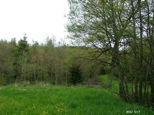 Grafik 3: Die Aufnahme vom 17.Mai 2016 zeigt das Frankenbachtal auf 460m Höhe in der freien Fläche Deutschlands zwischen Aalen und Ellwangen und zwar den sonnenbeschienen Südhang. Die verschiedenen Baumgruppen warten inzwischen die Eisheiligen ab und beginnen danach erst mit dem Blattaustrieb. Typisch sind auch die rotbraunen Blattaustriebe, die während der Kälte gelitten und das Wachstum kurzzeitig eingestellt haben.