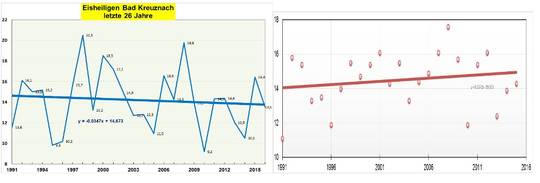 Mit Bad Kreuznach wollen wir eine Station aus dem Süden Deutschlands, aus der sonnigen Oberrheinebene darstellen, deren Werte seit 1991 vorliegen. 1991 war ein sehr kalter Mai mit kalten Eisheiligen. Die Trendlinie der Daten unseres interessierten Wetter- und kritischen Klimabeobachters Matthias Baritz haben die Steigungen: Gesamtmonat Mai seit 1991 y = 0,037x (positiv steigend), die Eisheiligen hingegen sind negativ ab Messbeginn 1991 mit y = -0,035x. Damit gehen beide Trendlinien seit 26 Jahren scherenschnittartig auseinander.