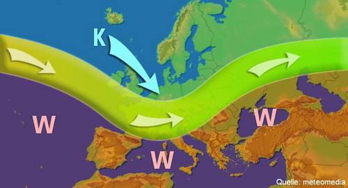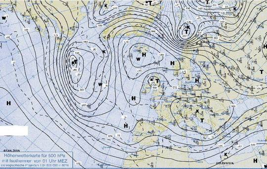 Da die Luftdruckverhältnisse in der Höhe direkt mit den Verhältnissen am Boden gekoppelt sind, konnte sich auch in bodennahen Schichten über Nord-, Mittel- und Teilen Südeuropas eine schwachwindige Wetterlage mit zahlreichen kleineren Tiefdruckgebieten ausbilden,…"