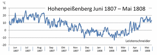 Abb.7 nach Daten des DWD zeigt den Jahresverlauf der Tagesmittelwerte der Temperatur auf dem Hohenpeißenberg von Juni 1807 – Mai 1808. Etwa dem gleichen Zeitraum nach dem Hauptsonnenzyklus in der Mitte der 1790-Jahre, wie Abb.6.