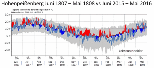 Abb.8: Unschwer zu erkennen, dass beide Temperaturverläufe nahezu deckungsgleich sind. Vor 200 Jahren war es genau so warm wie heute und dabei war 2015 laut DWD eines der wärmsten Jahre nach den Temperaturaufzeichnungen. Die Charts zeigen eindrucksvoll, dass nichts zu sehen ist von einer angeblich menchengemachten Erwärmung in unseren Tagen!
