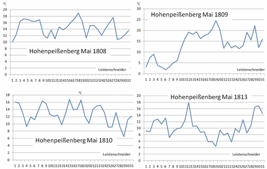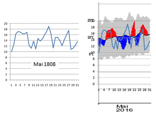 Abb.10: Die Mai-Temperaturen 1808 ähneln denen von Heute: Gleiches Muster (lediglich etwas zeitlich zueinander verschoben) und gleichen Max- und Min-Werten der Temperatur. Das Wetter war demzufolge ähnlich wie heute.