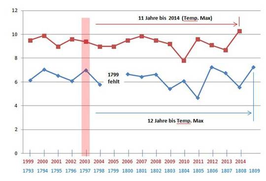 Gegenwärtig schreiben wir das Jahr 2016. Das Maximum im Hauptsonnenzyklus lag im Jahr 2003 (Jahrhundertsommer), also vor 13 Jahren. 1797 + 13 = 1810. Wegen der o.g. Unschärfe, die Betrachtung ab 1807 bis 1813.