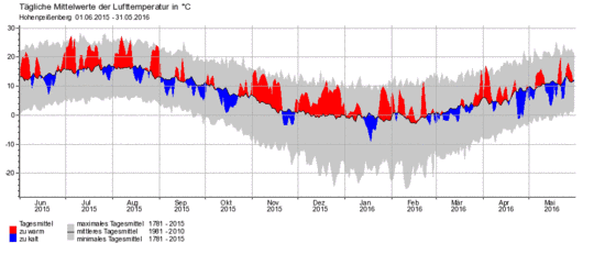 Abb.6 zeigt den Jahresverlauf der Tagesmitteltemperatur von Juni 2015 bis Mai 2016 auf der Referenzstation Hohenpeißenberg, Quelle: DWD. Der DWD hat dazu in seinen Abbildungen die jeweiligen Min/Max-Werte und die Abweichungen vom langjährigen Trend (rot/blau) angegeben.