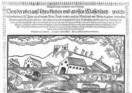 Abb.11: Flugschrift zum Hochwasserereignis 1651, Quelle: Bayer. Staatsbib. München, Fl.-Nr. 03099 aus “Zur Temperatur- und Hochwasserentwicklung der letzten 1000 Jahre in Deutschland“, R. Glaser, Ch. Beck, H. Stangl.