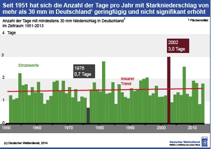 "Analysen des DWD haben ergeben, daß sich zumindest in Deutschland aus dem Zeitraum 1951 bis 2000 kein eindeutiger Trend zu vermehrten extremen Niederschlags-Ereignissen ableiten läßt."