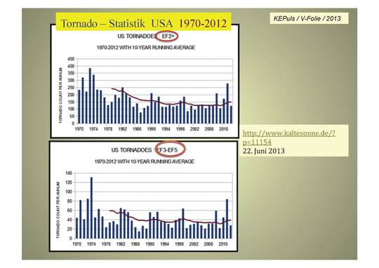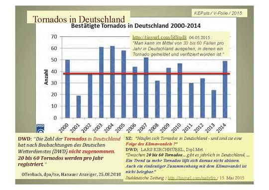 Während der hier besprochenen Unwetter-Lage [1] traten in der ersten Juni-Woche 2016 auch etliche Tornados in Deutschland auf. Sofort stellte sich die Frage, ob es bereits jetzt einen Trend zu mehr Tornados in Deutschland gibt. Das wurde meist ohne jegliches Hintergrundwissen der Daten und Messungen, ohne Prüfung der Fakten, ohne Hemmungen … mit "JA" beantwortet, wie hier exemplarisch in der Nordsee-Zeitung [9] : "…Tornados im Norden, sind wir mitten drin im Klimawandel?" … und der selbsternannte Hamburger "Klima-Experte" Frank Böttcher antwortete ohne Hemmungen und bar jeder Faktenlage: "Ganz genau. Der globale Temperaturanstieg bringt warme Luftmassen … in der Folge gibt es im Sommer mehr Tiefdruckgebiete, die immer wieder mit ihrer eigenen(!!?) Feuchtigkeit gefüttert werden … diese Phänomene nehmen infolge des Klimawandels bei uns weiter zu.“