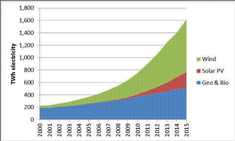 Kernkraft hat inzwischen angefangen, langsam zuzunehmen; Wasserkraft wächst stetig um etwa 90 TWh pro Jahr; und Erneuerbare wachsen exponentiell – im vorigen Jahr gingen 200 TWh des erzeugten Stromes auf das Konto der Erneuerbaren. Dieses Wachstum ist hauptsächlich der Windkraft geschuldet: