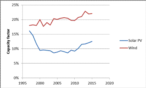 Der BP-Report vermittelt eine Abschätzung der Effizienz von Wind- und Solarenergie, weil sowohl die installierte Kapazität als auch die erzeugte Energie angegeben werden. Der globale Kapazitäts-Faktor für Solar-PV lag unter 10%, ist aber während der letzten Jahre auf etwa 12% gestiegen. Der Kapazitätsfaktor von Wind hat stetig zugenommen und liegt jetzt bei etwa 22%: