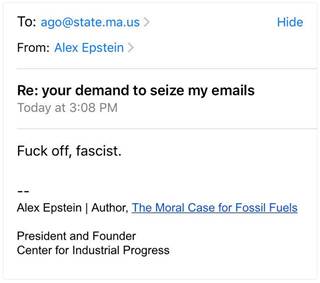 Ein starkes Zitat von Alex Epstein, Leiter des „Center for Industrial Progress, eine Beratungsfirma, Kalifornien als Antwort an Frau Justizministerin Healey bezüglich ihrer Anordnung, seine Emails zu beschlagnahmen: