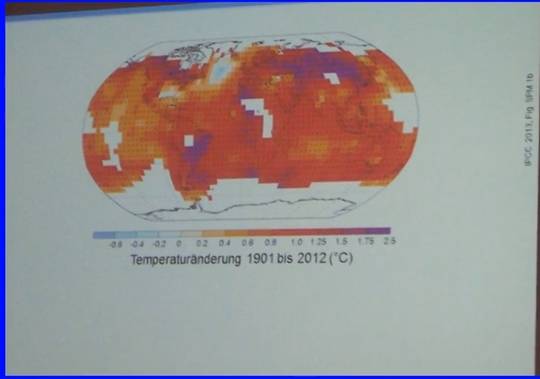 Min 13:40 das ist die Karte die wir den politischen Entscheidungsträgern vorgelegt haben,.. sie zeigt die Temperaturtrends von 1901 bis 2012 in denjenigen Orten der Welt wo wir (13: 50) genügend qualitativ hochstehende Messungen haben.. …Min13:58 Die Welt ist nicht ganz farbig sie ist auch nicht ganz weiß, im Gegenteil wir können in den meisten Gebieten – die wichtig sind, wenn es um die Diskussion des Klimawandels geht, den Trend angeben und (14:08) wir können diesen Trend robust angeben,…statistische Robustheit ist hier indiziert durch Kreuze (nicht erkennbar) ..14:18 mit Ausnahme des Nordatlantischen Ozeans, wo sie eine Abkühlung haben, haben sie überall eine statistisch signifikante Erwärmung …. wir haben aber auch Regionen – dass muss man deutlich sagen, wo wir zu wenig Daten haben. (Anmerkung: Untertreibung des Jahres) um über die lange Periode von über 100 Jahren eine verlässliche Aussage zu machen..Trotzdem … 14:46 „Die Erwärmung des Klimasystems ist eindeutig“