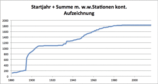 Nach den Untersuchungen von F.K. Ewert anhand der NASA GISS Listen von 2010 lieferten aber nur 1086 Stationen über 100 oder mehr Jahre kontinuierlich Temperatur-Daten. Und davon lagen ca. 80 – 85 % in den USA und Europa. In den Folgejahren kamen zwar rd. 6000 Stationen dazu, von denen aber nur weitere 757 Stationen Daten aufwiesen, die für Langzeitvergleiche, dank ununterbrochener Aufzeichnungs-Dauer, tauglich sind. Das ist zwar schon eine bessere Datenbasis, aber lange noch keine gute, wenn man allein an die riesige Landfläche von 146 Mio km^2 denkt deren Klimaentwicklung es zu beurteilen gilt.