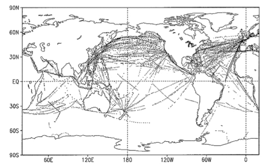 Auf den Ozeanen – immerhin zu 71 % die Erdoberfläche bedeckend- gab es außerhalb der Hauptschifffahrtsrouten so gut wie keine Messungen. Mit am dichtesten befahren war und ist die Nordatlantik Route, die bei Stocker aber einen weißen Fleck zeigt.