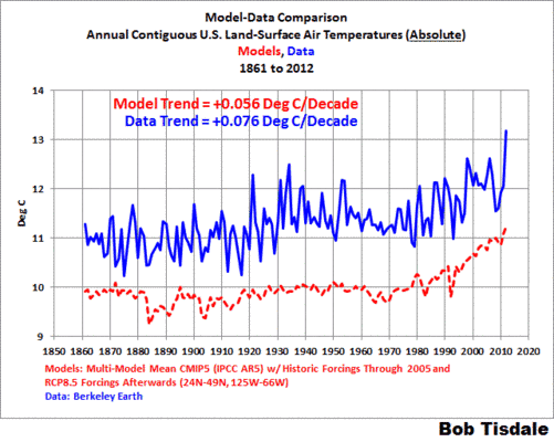 Viertens: Die Tatsache, dass die Modelle die beobachteten Erwärmungsraten für den späteren Zeitraum besser simulieren hat keinen Wert. Das Modell Konsens und die Daten zeigen, dass die Temperaturen der Vereinigten Staaten sich natürlich mit Raten erwärmen können, die mehr als 2,5-Mal höher sind, als die durch den Konsens der Modelle gezeigten. Dies deutet darauf hin, dass die modellbasierten Vorhersagen der zukünftigen Erwärmung für die USA viel zu hoch sind.