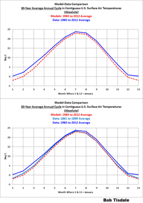 Man könnte sagen, es ist nur eine Modell-Daten-Differenz von -1,4 Grad Celsius, während der Jahreszyklus für die USA ca. 24 Grad Celsius beträgt. Aber lassen Sie uns den Jahreszyklus der Beobachtungen für die ersten 30 Jahre, 1861-1890 mit einschließen. Die hellblaue Kurve ist in Abbildung 3 oben zu sehen. Die Veränderung der beobachteten Temperatur im 30-Jahres-Zeitraum von 1861-1890 bis zum 30-Jahres-Zeitraum 1983-2012 ist etwa 1,0 Grad Celsius, während die Differenz der Modelldaten für den Zeitraum von 1983 bis 2012 größer ist, etwa 1,4 Grad Celsius.