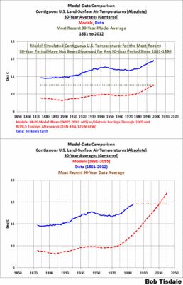Die Modelle können offensichtlich die beobachteten Temperaturen für die USA nicht simulieren. Die modellierten Temperaturen sind für die jüngsten 30-jährigen Temperatur-basierte Klima zu kühl, für den Zeitraum von 1861 bis 1890 sind sie sogar unterhalb der beobachteten Temperaturen. Das heißt, die simulierten Temperaturen für die USA über die letzten 30 Jahre, hat es in dem modellierten Zeitraum nicht gegeben.
