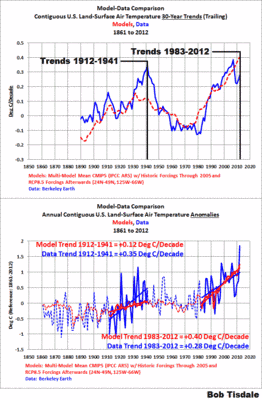 Ein paar Dinge zeichnen sich im oberen Diagramm der Abbildung 5 heraus. Erstens sind die beobachteten 30-jährigen Erwärmung Raten bis in den späten 1930er Jahren, Anfang der 1940er-Jahre vergleichbar mit den jüngsten, beobachteten 30-Jahres-Trends. Mit anderen Worten, die Erwärmungsraten der letzten 30 Jahre der USA ist nichts Ungewöhnliches – überhaupt nichts Ungewöhnliches.