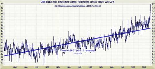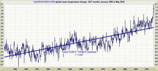 Weiter. Reuters „berichtet“ ungefragt, dass „im Zuge des Pariser Abkommens fast 200 Regierungen zugestimmt haben, die globale Erwärmung deutlich unter 2°C zu halten, verglichen mit dem vorindustriellen Niveau, während ,Bemühungen‘ verfolgt werden sollen, sie unter 1,5°C zu halten – einem unteren Limit, dass schon jetzt fast erreicht ist“. Oh Mann – nein! Zieht man das Mittel aller drei Datensätze heran, beträgt der Erwärmungstrend seit 1880 etwas mehr als 0,9°C, was noch einen Spielraum von 0,6°C übrig lässt, bevor das neue willkürliche Ziel von 1,5°C erreicht wird – und einen solchen von 1,1°C, bevor das zuvor gesetzte willkürliche Ziel von 2°C erreicht wird.