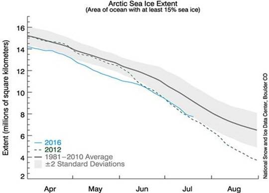 Der Graphik des National Snow and Ice Data Center zufolge ist es möglich, jedoch recht unwahrscheinlich, dass es ein oder zwei Wochen lang in diesem Sommer keine arktische Eiskappe geben wird: