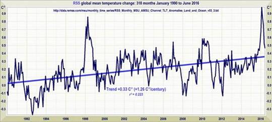 El Niño-Spitzen der Jahre 1998, 2007, 2010 und 2016. Die Rate der globalen Erwärmung seit 1990, äquivalent zu 1,26 K pro Jahrhundert, liegt weit unterhalb des vom IPCC prophezeiten Intervalls von 2,8 (1,9; 4,2) K pro Jahrhundert.