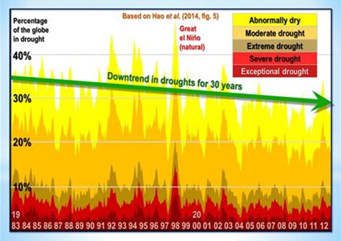 Wir hatten es schon immer mit Hitzewellen und Wolkenbrüchen zu tun. Bezüglich Dürren zeigt die jüngste umfassende Übersicht von Hao et al. 2014, dass es zu einem Rückgang der Festlandsgebiete gekommen war, die von einer Dürre heimgesucht wurden: