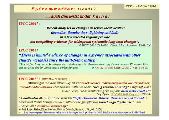 Abbildung 6: Zitate aus den jüngsten IPCC Berichten zur nicht vorhandenen Zunahme von Extremwetterereignissen . Quelle IPCC, Auswahl K.E. Puls