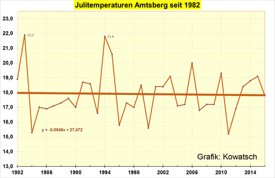 Abb. 2: Das Ergebnis ist überraschend: Die Klimastation Amtsberg zeigt seit 1982 bis 2016 eine leicht fallende Trendlinie. Man beachte auch: Juli 1982: 19C, Juli 2016: 17,8C.