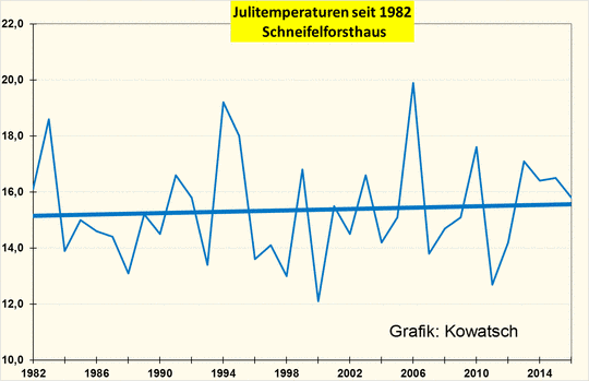 Abb. 3: Auch Schneifelforsthaus, diese Station ganz im Westen Deutschlands an der belgischen Grenze zeigt seit 35 Jahren keine Julierwärmung. Die Trendlinie ist nicht signifikant steigend.