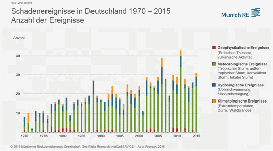 Die Grafik zeigt eine schlimme Verschlechterung, wie es auch in der Legende deutlich hervorgehoben wird. Und sicher könnte man daraus ableiten, dass der Klimawandel in Deutschland zu immer schlimmeren Katastrophen führt. Aber warum ist das Bild aus einer Publizierung vom Jahr 2012? Gibt es wirklich nichts Aktuelleres? MuRe veröffentlicht seine Berichte doch jährlich? Und das gibt es, ganz aktuell vom Jahr 2016 [2].