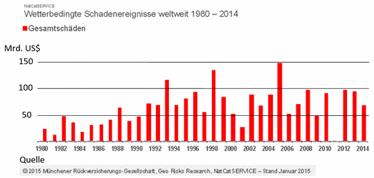 Bild 4 MuRe Wetterbedingte Schadenereignisse weltweit 1980 – 2015 Gesamtschäden. Grafik vom Autor aufbereitet (Wertebalken auf die Null-Linie gesetzt)