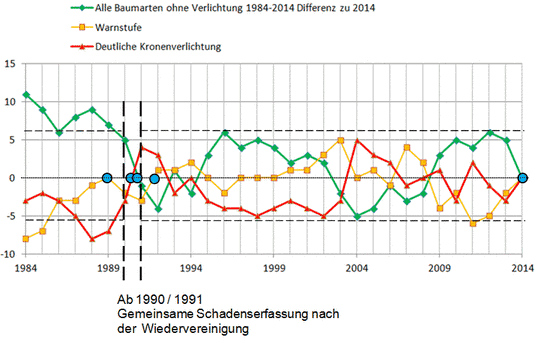 Bild 8.1 Verlauf des Schadenszustandes von 1984-2014 für alle Baumarten. Quelle: Bundesministerium für Ernährung und Landwirtschaft, März 2014. Ergebnisse der Waldzustandserhebung 2014