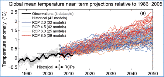 Bild 10.1 Vergleich Globale Temperatur Messwerte und Simulationen. Schwarze, horizontale Linie vom Autor ergänzt. Quelle: ClimateChange