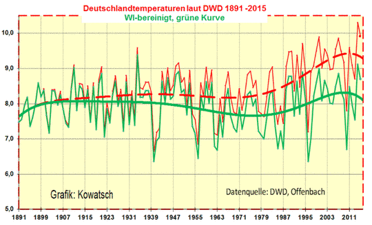 Bild 10.2 Temperaturverlauf Deutschland ohne (DWD-Daten) und mit Wärmeinsel-Effekt von 1891-2015. Quelle: J. Kowatsch