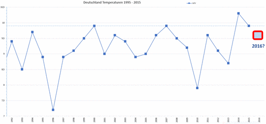 Bild 10 Globaltemperatur Deutschland von 1992 – 2015 (Grafik des Autors anhand der WIKIPEDIA-Daten[4], sind die Daten des DWD)