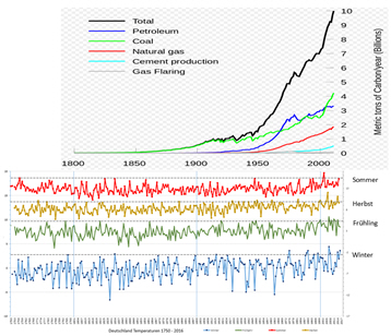 Bild 12 Langfrist-Temperaturreihe der Jahreszeiten von Deutschland (1750 – 2016) und CO2-Anteil der Atmosphäre vom Autor als Grafik zusammengesetzt