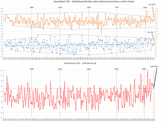 Ergänzend die Temperaturen der Monate Mai bis Juli Deutschland (Bild 13). An diesen für das Wachstum wichtigen Monaten zeigt sich, dass im Detail oft überhaupt kein Klimawandel-Einfluss vorliegt. Gerade auch die aktuellen Hochwasser können niemals (wie oft gemeldet) durch klimawandel-bedingt gestiegene Mai-/ Juni-Temperaturen verursacht sein, wie Bild 13 belegt. Selbst der vermeintlich spektakuläre Juli stellt sich wieder wie vor 1700! dar und der „Schlimme“ vom Jahr 2015 lag Deutschland-global niedriger als viele vor mehr als 200 Jahren.